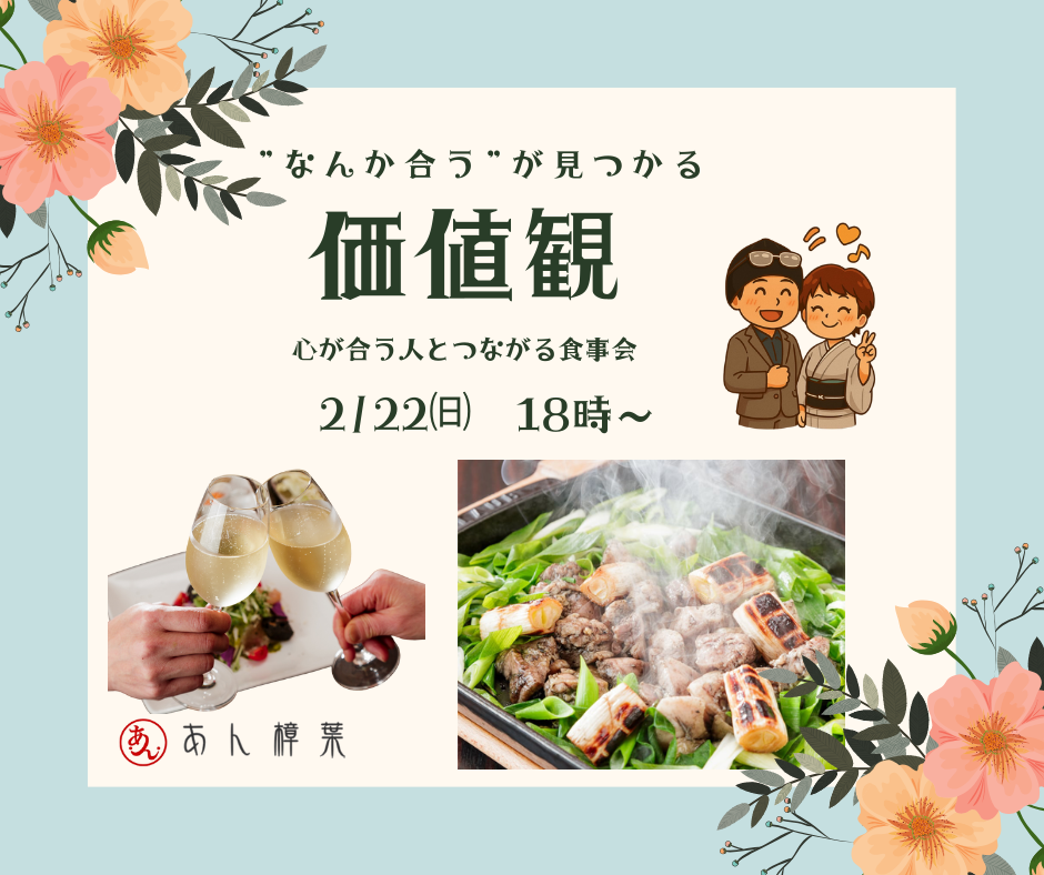 26/02/22(日) 18:00~ 【あん樟葉】 価値観フィットコンパ 男性30~55才 女性30~55才