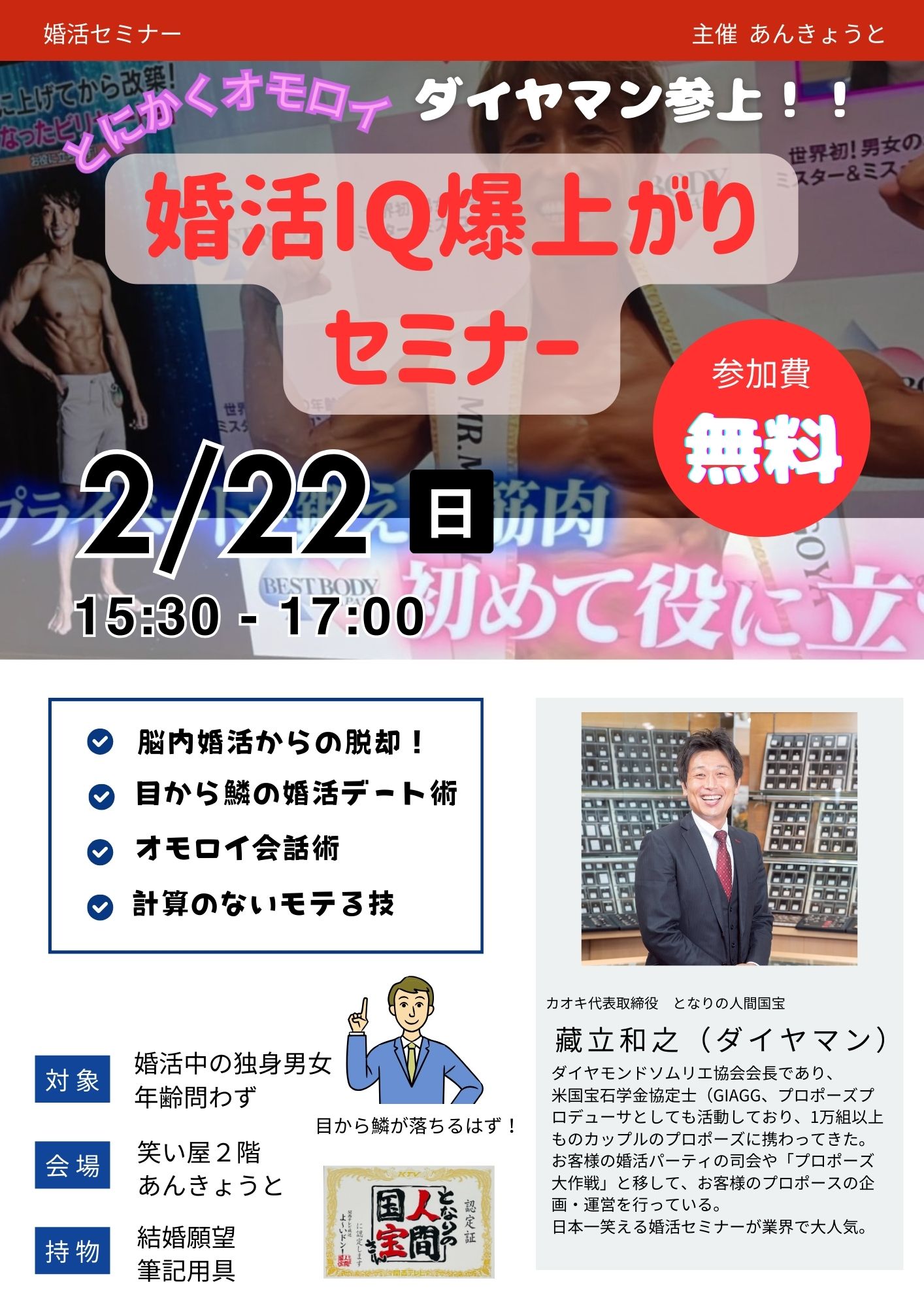 婚活の天才ダイヤマン(「カオキ」代表取締役 蔵立氏)の話を直接聞けるチャンス‼ 「この講座を受け続けた方は、次々に成婚している」という噂まであるんです♡ 今回は 男女合同企画 ! テーマは…「トーク術 & スリーセット理論」 笑いあり学びありで、すぐに実践できるテクニックが盛りだくさん! さらに、講師の蔵立氏は あの「となりの人間国宝さん」にも認定されている、まさに婚活講座のカリスマ‼ 笑いあり学びありで、すぐに実践できるテクニックが盛りだくさん! めちゃくちゃ参考になること間違いなしの対面セミナーです‼